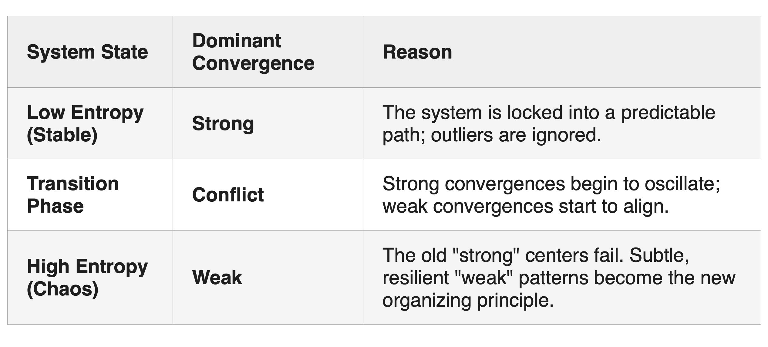 Why They Dominate: In a high-entropy environment, the very strength of a strong convergence becomes its weakness. As the system moves toward a “massive attractor shift,” the strong convergence breaks, while the weak convergences—which were already adapted to the chaos—coalesce to form the new foundation.